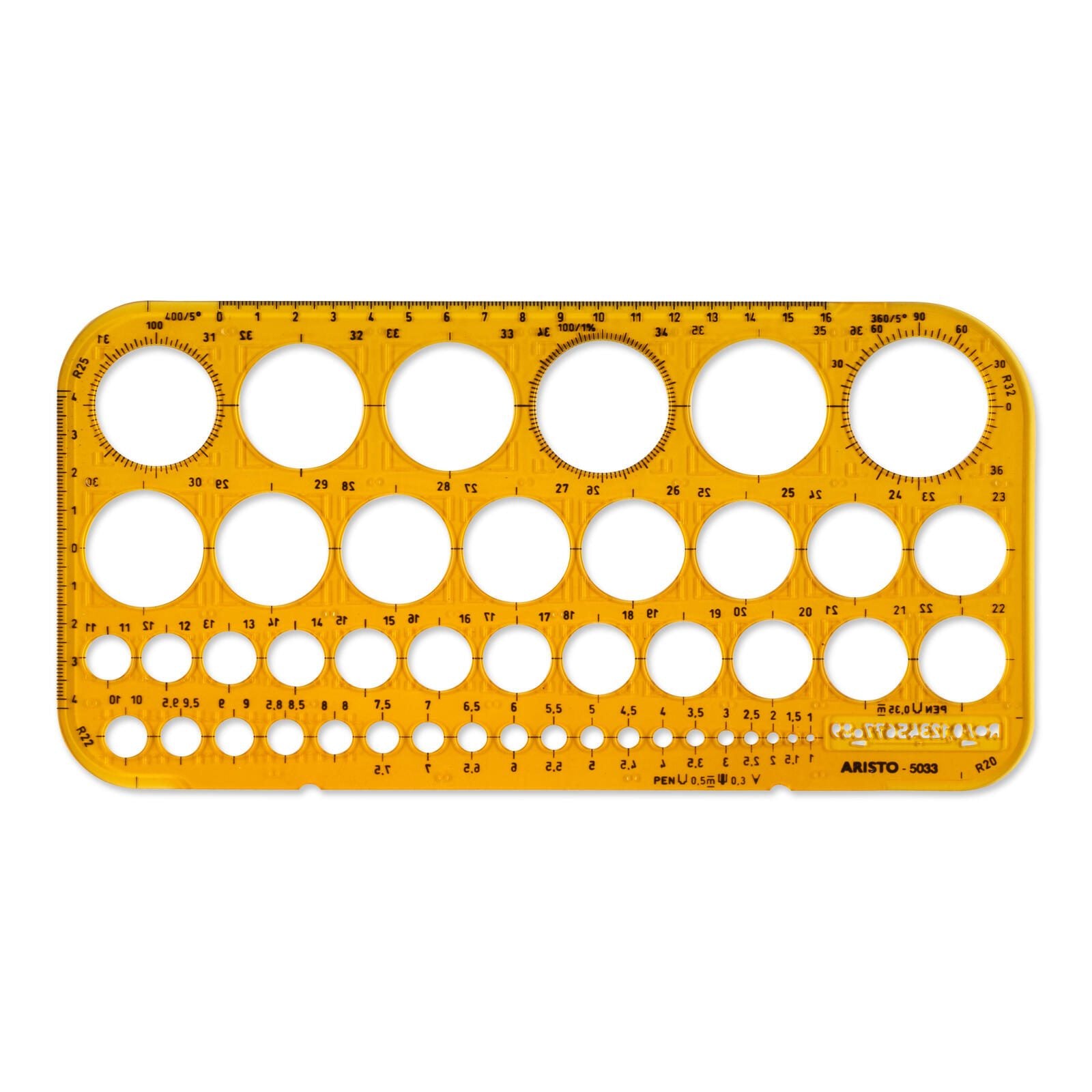 Die Aristo Zeichenschablone Aristo Kreisschablone bietet Ihnen eine hochwertige Lösung für präzises technisches Zeichnen. Die Schablone ist aus stabilem Kunststoff gefertigt und in einem attraktiven orange-transparenten Farbton gehalten. Mit einem Durchmesserbereich von 1-36 mm können Sie mühelos Kreise in verschiedenen Größen zeichnen.